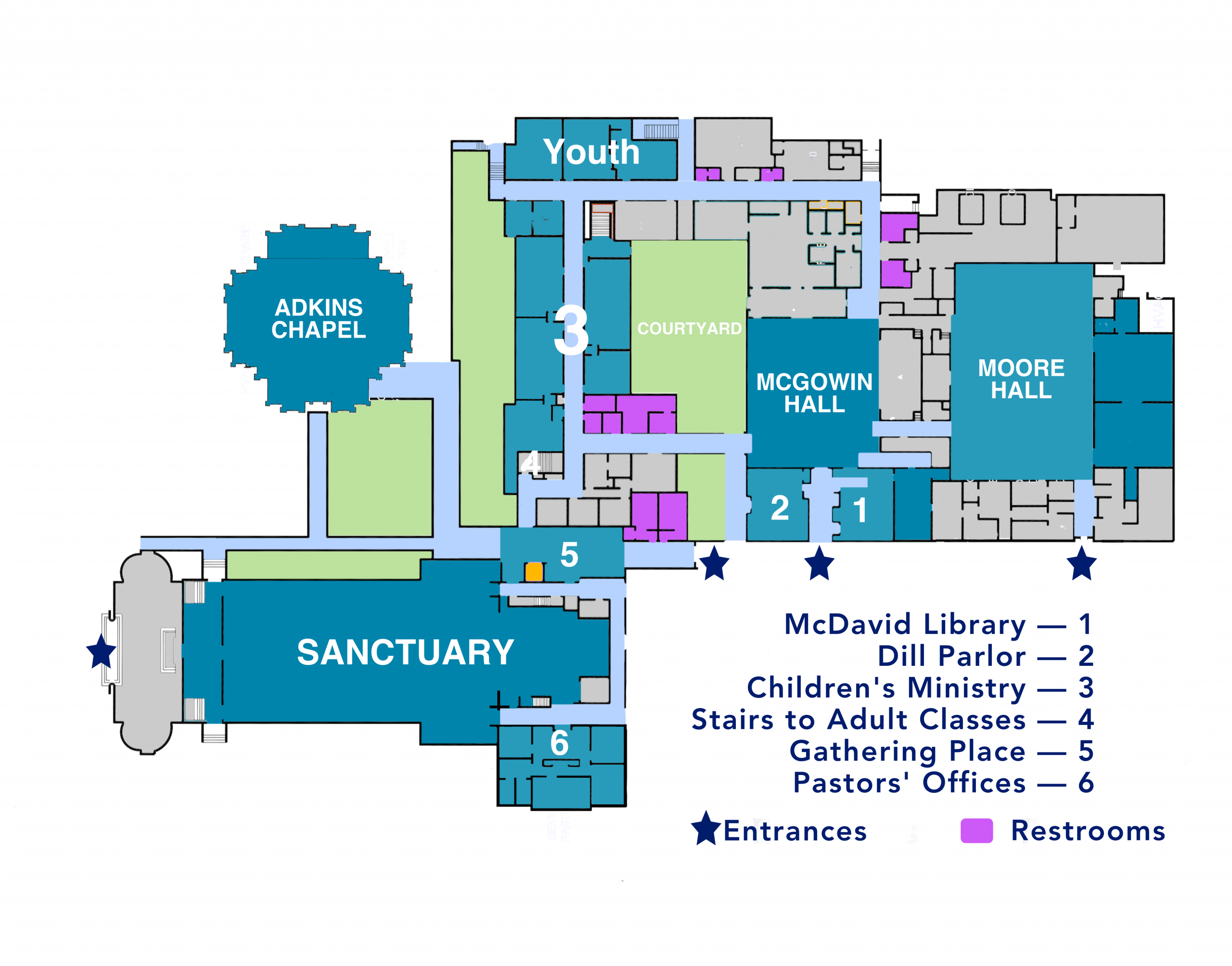 We would love to welcome you to our church. There is truly something for everyone here and we hope to meet you soon! If you need directions on Sunday Morning, please find us at the Welcome Desk in McGowin Hall (entrance located on Catherine Street) and we will be glad to help you reach your destination.